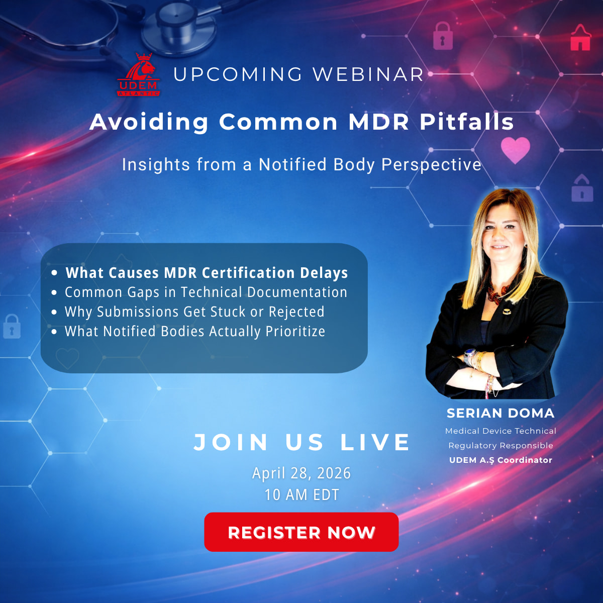 Hosted by UDEM Atlantic, the U.S. office of European Notified Body 2292, this session will provide a clear overview of how manufacturers can approach MDR certification with confidence and clarity.